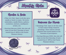 "Needles & Hooks" — Fiber Arts Club. Open to all who use a needle or hook to create! We invite embroiders, needle felters, quilters, crocheters, knitters, needlepoint artists, etc. Starting February 2026, this club will meet on the first Thursday of each month from 6–8PM at the Prairie Museum Library.